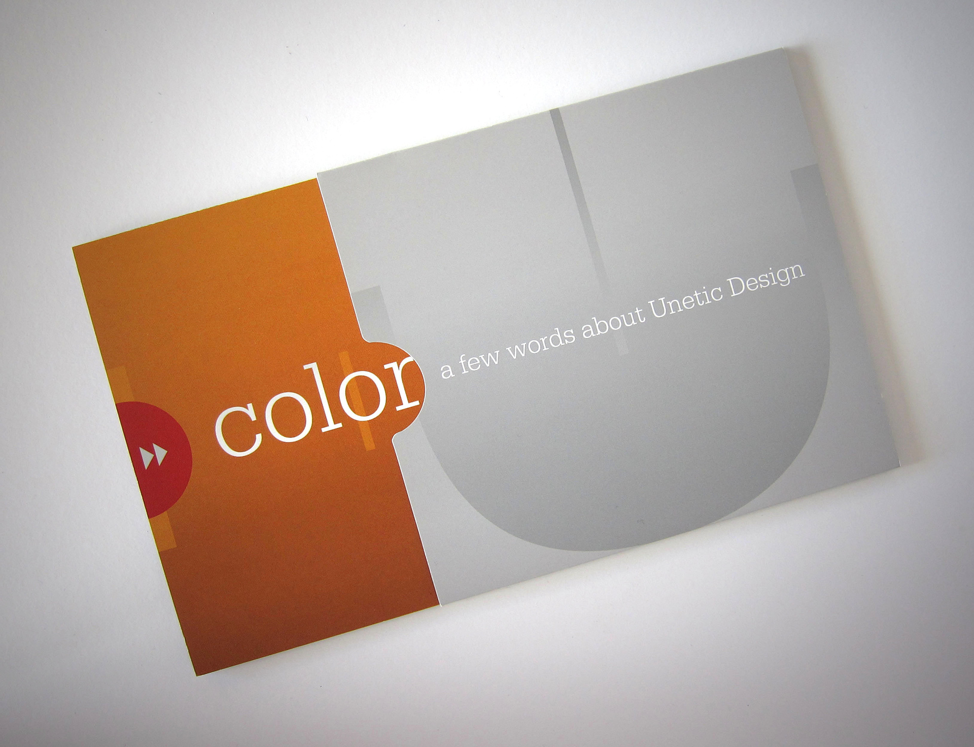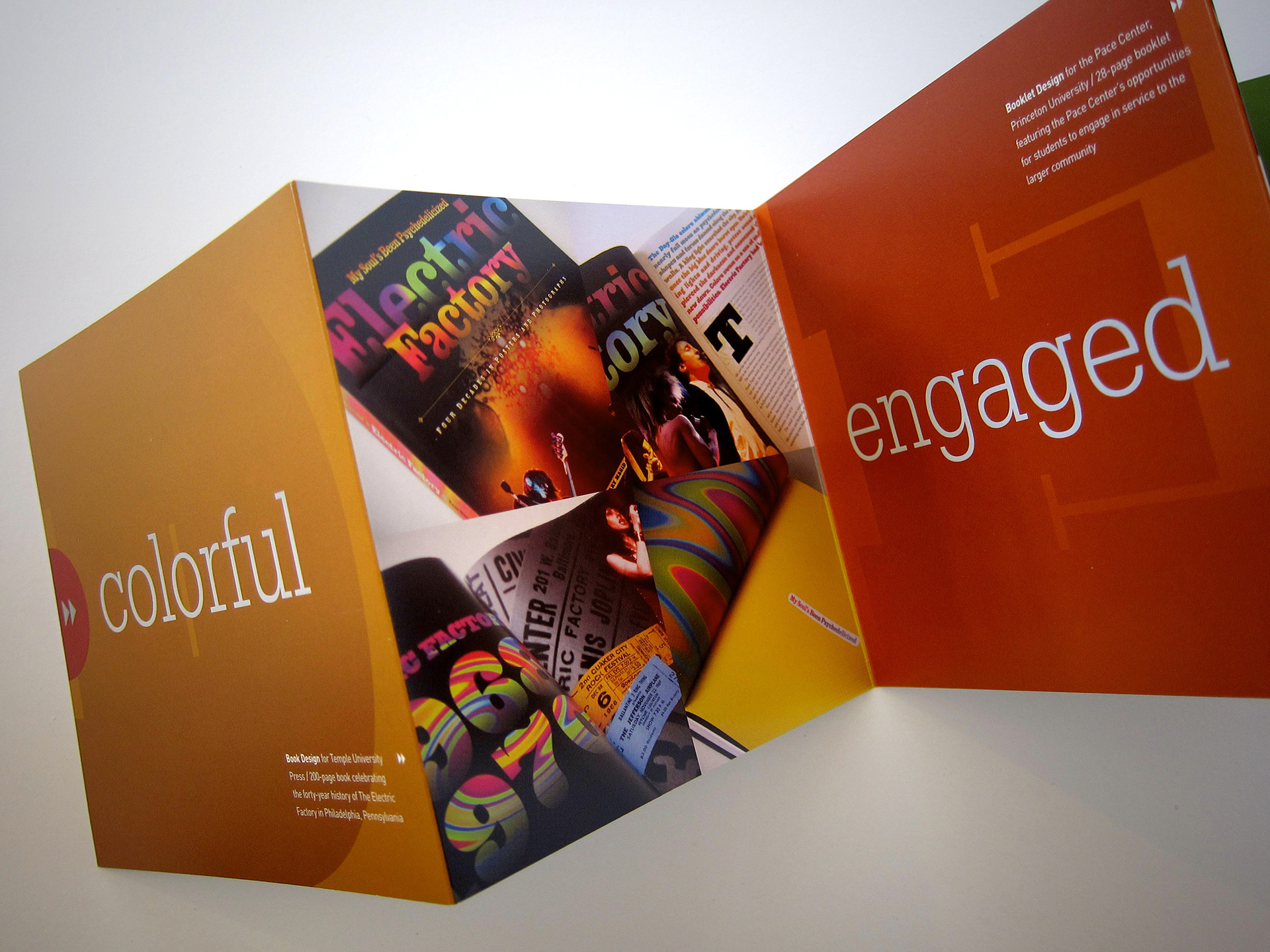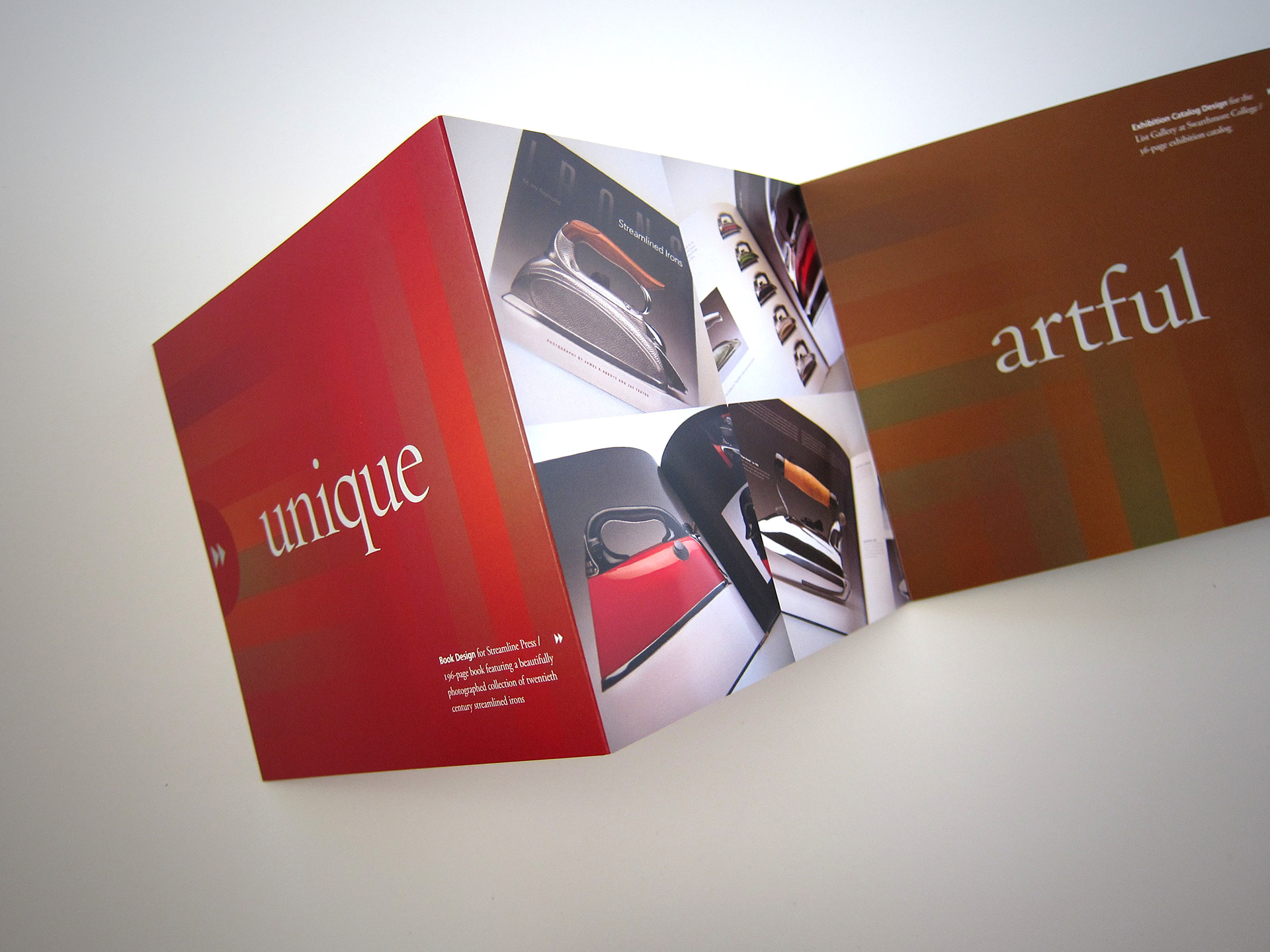 Two self promotion pieces created to feature different types of print work. Two one-color diecut sleeves packages two separate accordian fold brochures. 5 x 5.5 inches.